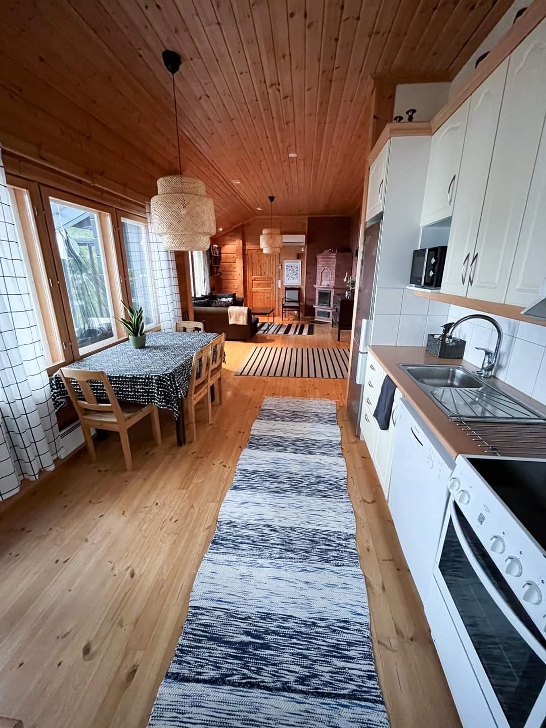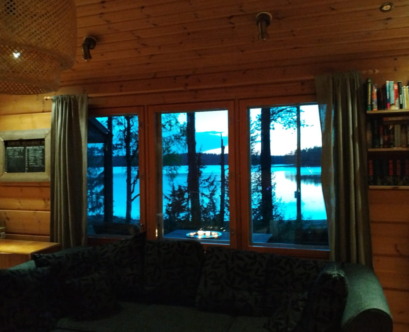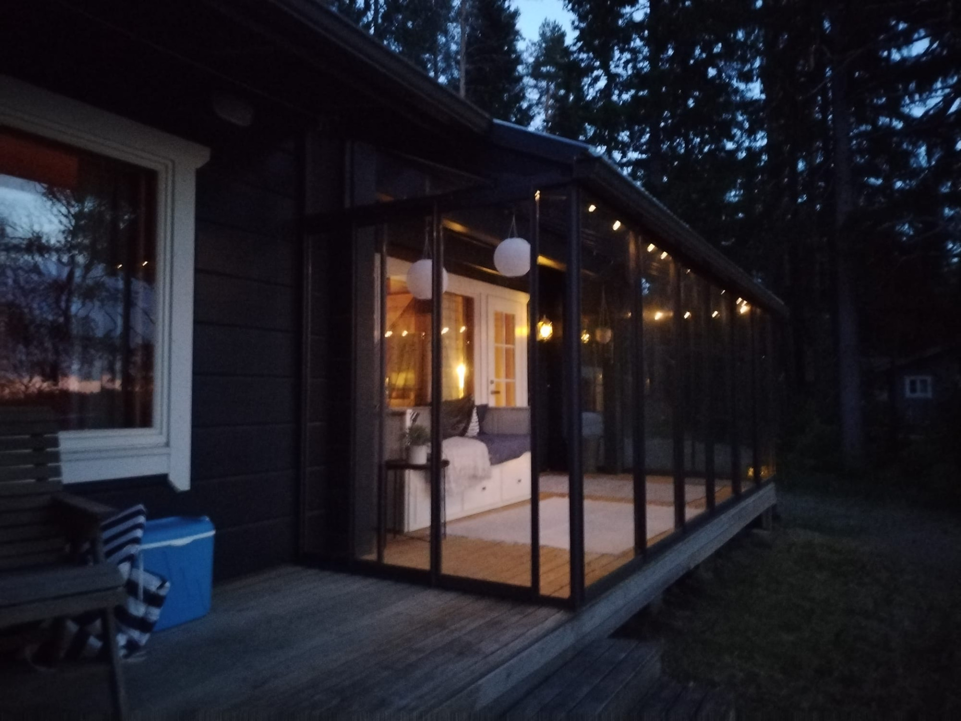 Paikka oli rauhallinen, mökki todella siisti ja tilava, sisällä kaikki mitä ihminen tarvitsee. Lasitettu terassi ihanilla valoilla toi tunnelmaa, ja takka, kun ilma alkoi kylmetä ei muuta kuin tuli takkaan ja villasukat jalkaan. Järven rannalla tilava grillikota.