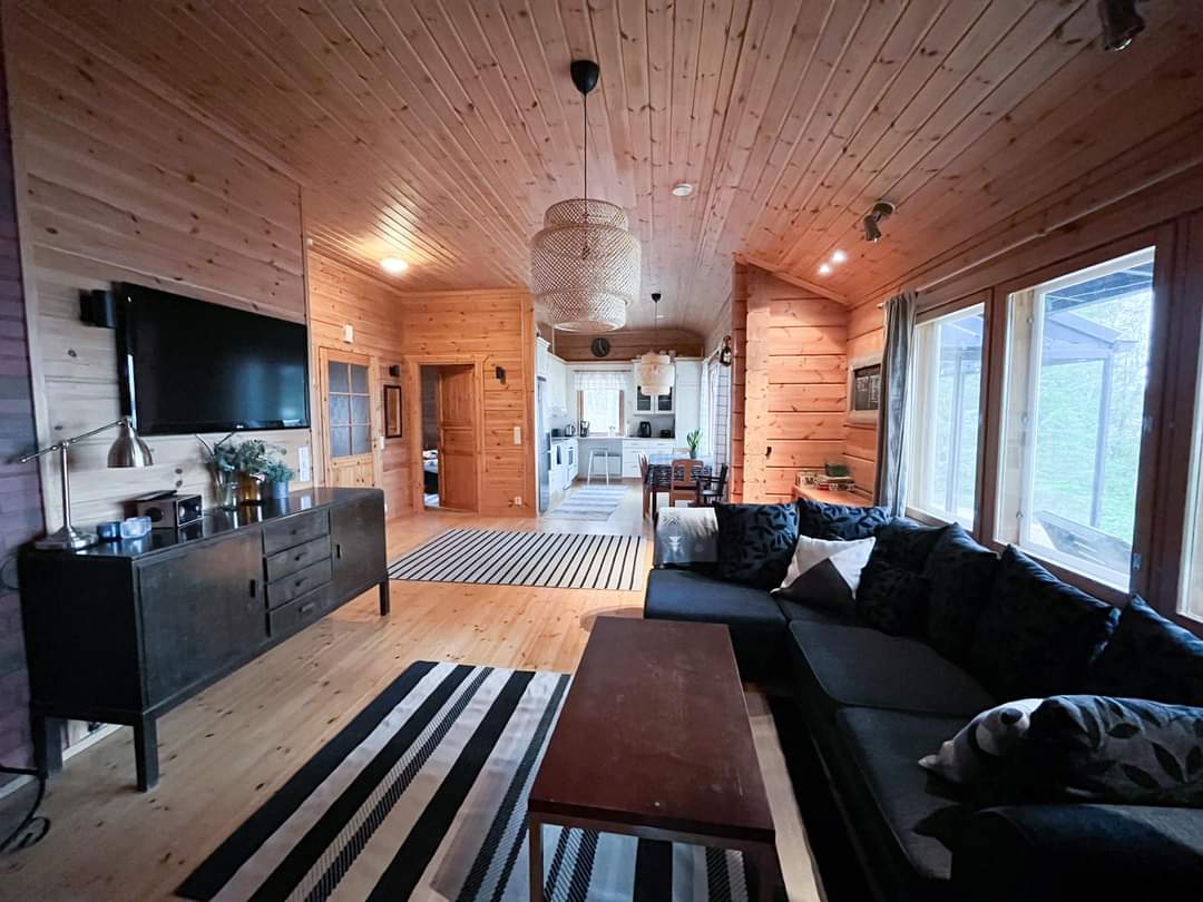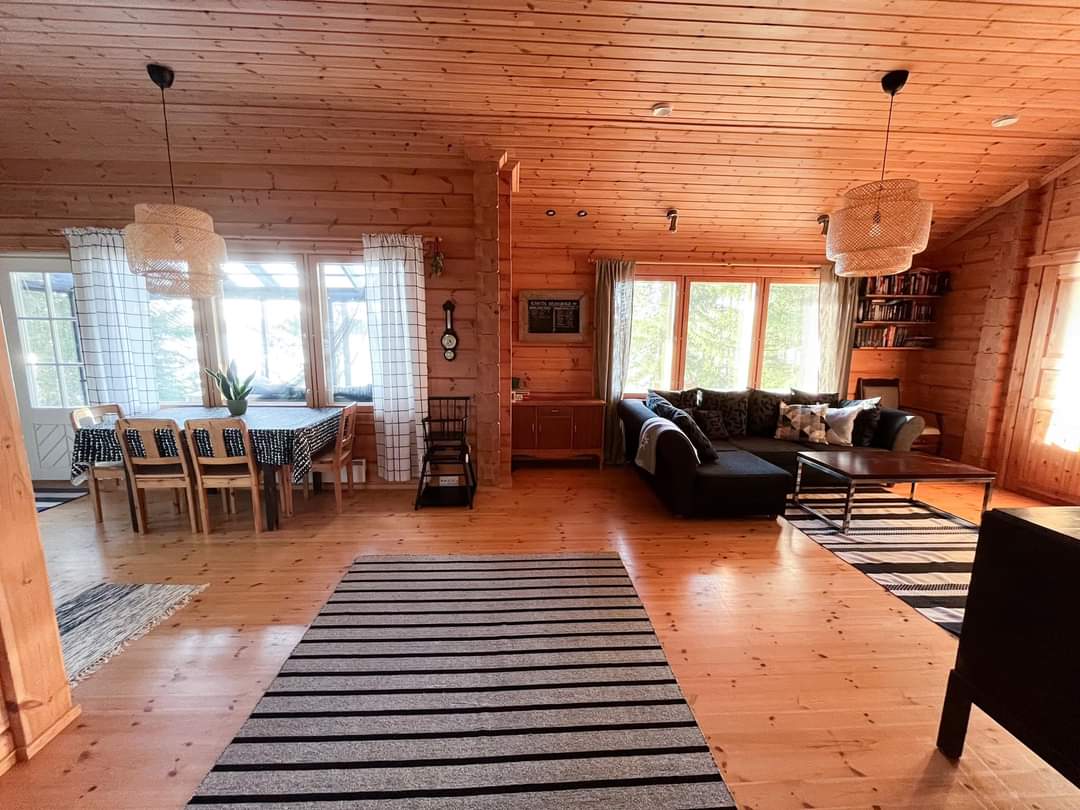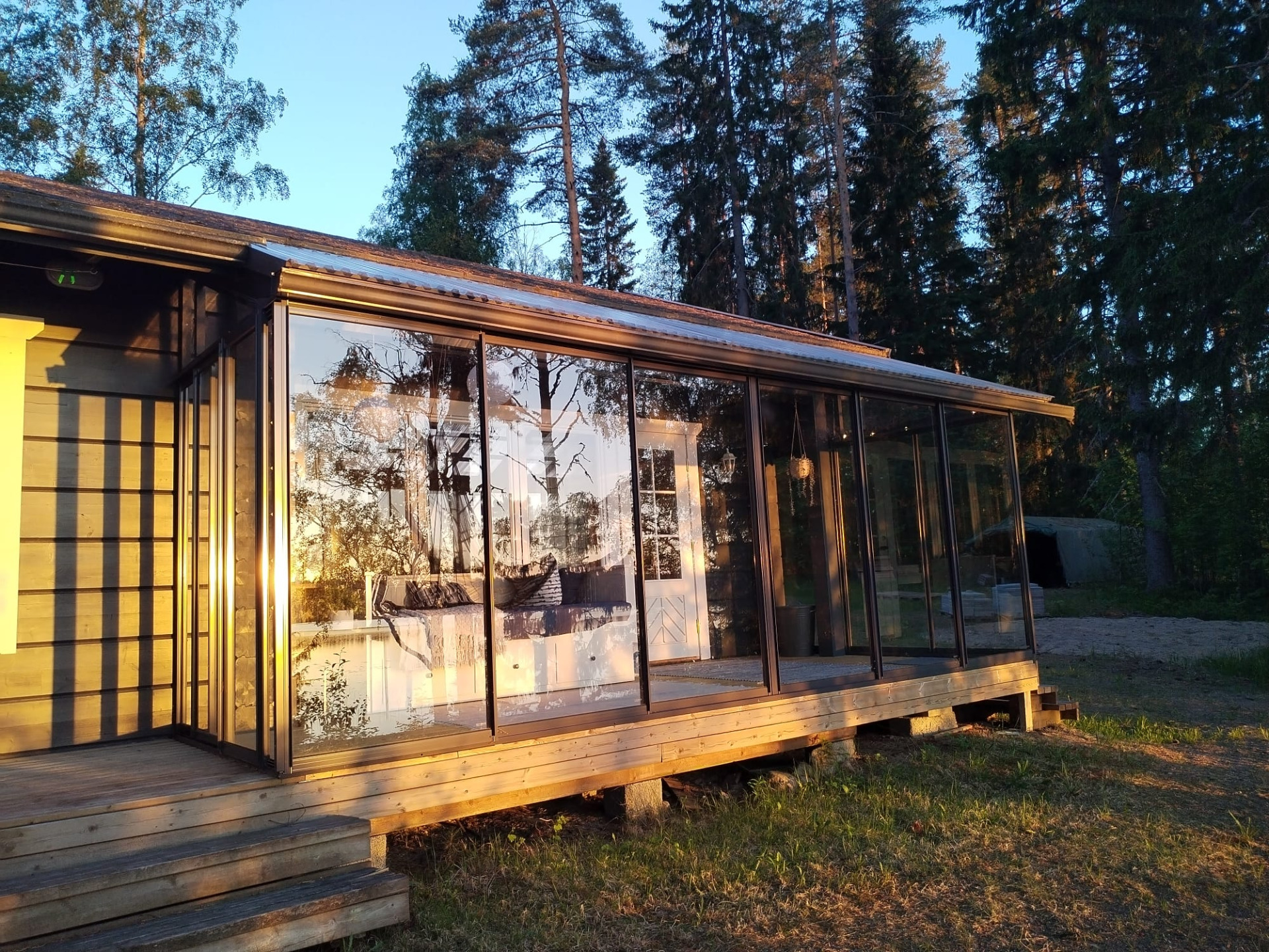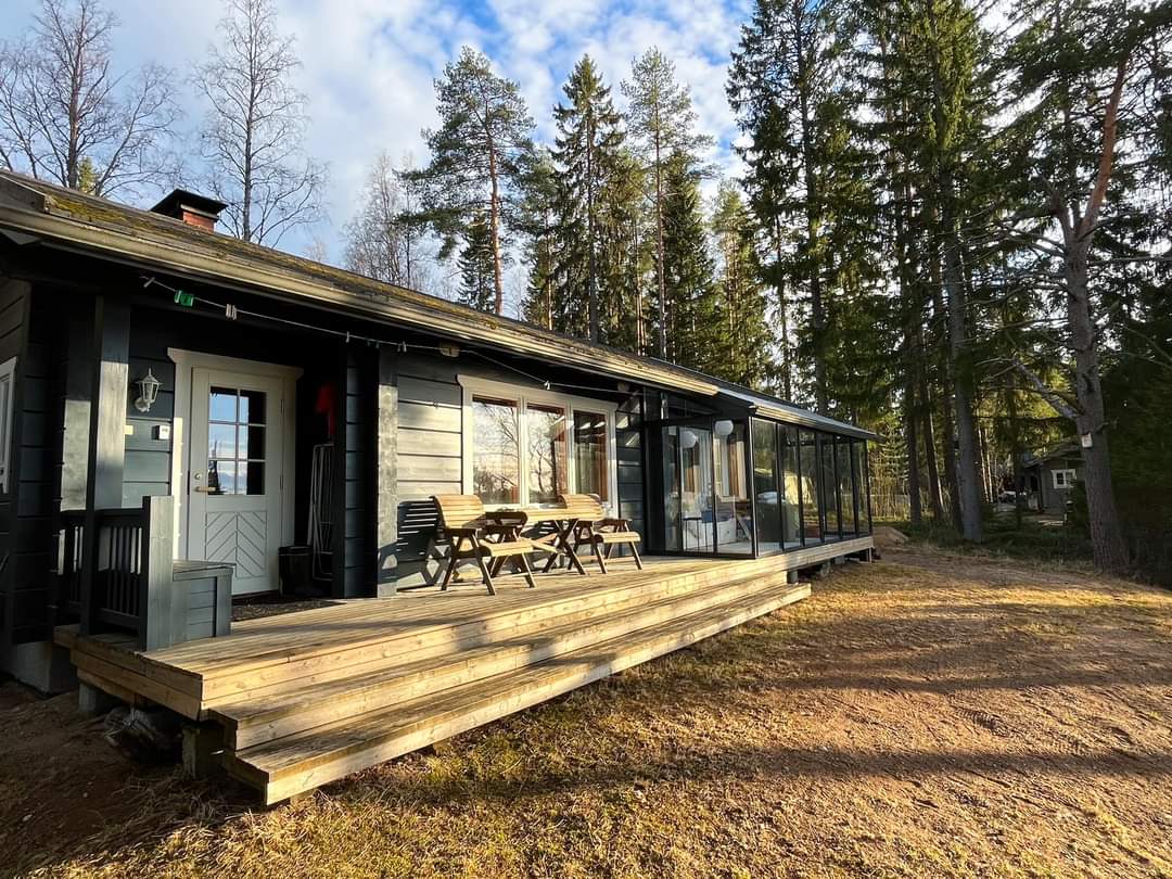 Paikka oli rauhallinen, mökki todella siisti ja tilava, sisällä kaikki mitä ihminen tarvitsee. Lasitettu terassi ihanilla valoilla toi tunnelmaa, ja takka, kun ilma alkoi kylmetä ei muuta kuin tuli takkaan ja villasukat jalkaan. Järven rannalla tilava grillikota.